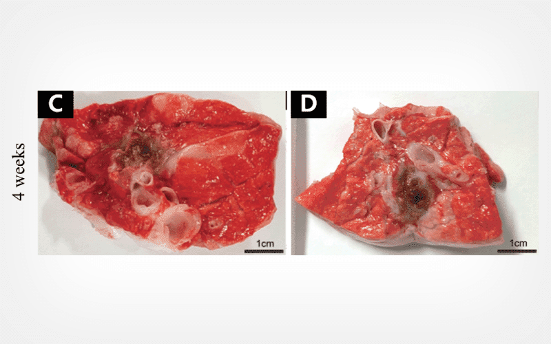 The cryoablation outcomes and inflammatory responses observed in the percutaneous group were largely consistent as compared to those previously published in the transbronchial groups. Similar trends in the histopathological transition from the center to the periphery of the ablation zone and tissue repair process was exhibited between two groups within 4 weeks. Two cases of pneumothorax occurred in the percutaneous group.