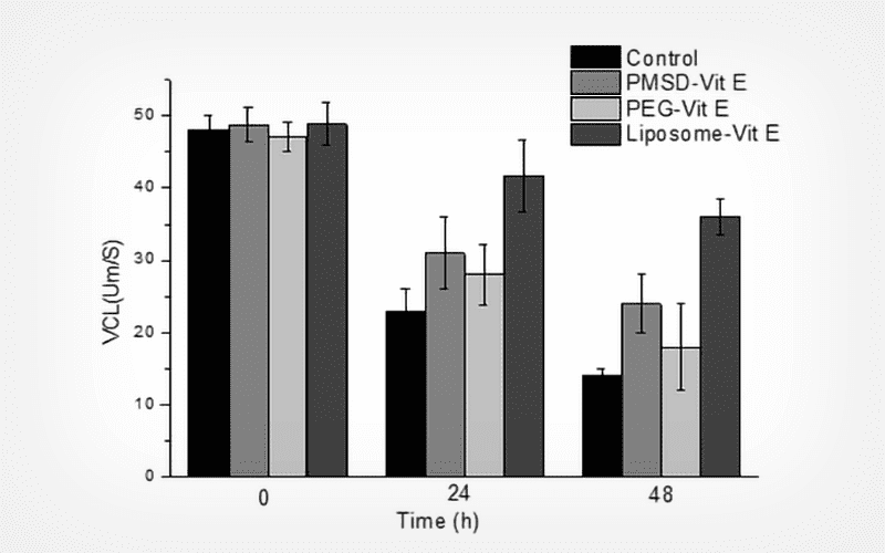 The release profiles of VitE and Chl varied considerably, depending on the specific carrier systems. For liposome-loaded VitE and Chl, the Korsmeyer-Peppas model gave the best fit; for CD/VitE and CD/Chl, the Higuchi model provided the best fit, whereas for PEG-6000 dispersions (VitE and Chl) both the Higuchi and Korsmeyer-Peppas models demonstrated the excellent fit. All systems indicated a Fickian diffusion mechanism dictated by the concentration gradient. The delivery of VitE and Chl with CD, liposome and PEG dispersion significantly increased sperm mobility and motility. The effect on the VCL parameter was the greatest by liposome-loaded VitE and Chl, followed by CD encapsulation and PEG-6000 dispersion.
