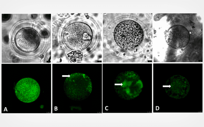 Vitrification alters the ultrastructure, membrane potential and distribution of mitochondria in oocytes, most likely caused by toxicity and mechanical injury.